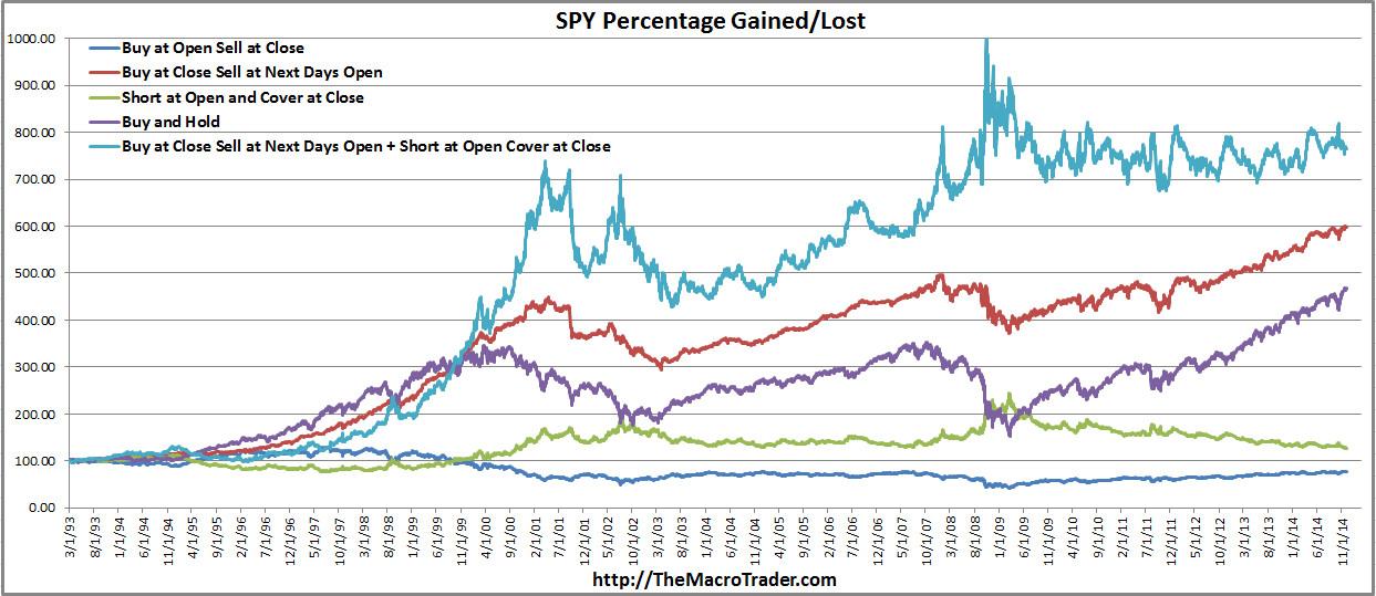 I did some yahoo data manipulating and come up with the same results as the chart above, pretty interesting. Even in recent years overnight has outperformed intraday, but intraday returns have gotten better.